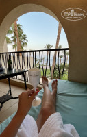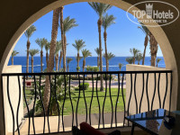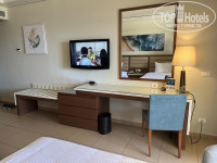 В отель мы приехали в начале девятого утра, нам предложили оставить чемоданы на ресепшн и позавтракать с дороги, потом пойти на пляж/погулять и подойти на заселение в 14.00, что мы и сделали. При оформлении нам сделали апгрейд до PREMIUM ROOM Beach Front и дали номер на втором этаже с прямым видом на море во втором корпусе (номера той категории, которая была прописана в нашей путевке, находятся в корпусе номер 3 и 4, как я поняла, и вид на море там частичный, у нас же балкон смотрел прямо на море). Номер просторный, уютный, чистый, ремонт мне показался относительно свежим-во всяком случае я не заметила, что интерьер «уставший». Не совсем удобно было то, что кровати раздельные - при заселении мы спросили, нет ли номера с одной кроватью, нам ответили, что в этом корпусе нет. Ну да ладно, шикарный вид с балкона это неудобство компенсировал сполна. Сам балкон тоже очень уютный, с восточным колоритом. Мебелировка номера стандартная: кровати, тумба, кресла и маленький столик, встроенный шкаф, большой стол у зеркала, на балконе тоже есть стол, встроенный диванчик и кресло. Есть телевизор (не включали), чайный набор, холодильник, сейф и фен. Гладильная доска и утюг тоже были в номере. Ванная комната просторная, оснащена душевой кабиной. Очень удобна большая столешница около раковины-комфортно разместились все мои флакончики и тюбики) мыльно-рыльные принадлежности отель предоставляет (мыло, гель для душа, шампунь, лосьон для тела, вероятно было что-то ещё, я не запомнила), пополняли по мере расходования. Питьевую воду также оставляли ежедневно. До моря от номера идти 1-2 минуты, до основного ресторана подальше-минут 5-10, но нам было приятнее быть ближе к морю, чем к еде😄