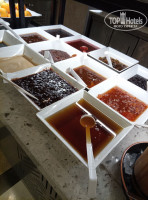 Ресторан: выбор блюд очень широкий, мясо (говядина, курица, индейка), рыба (на гриле (жена уже скучает по сибасу), стейки, на пару), гарниры (овощные, рис, картофель печёный, фри и пюре), мне понравился перец в горшочке (мясистый перец фаршированный мясом и ещё чем то), несколько видов сыров, колбас, салаты, овощи, зелень, фрукты (были постоянно: яблоки, груши, апельсины, мандарины, киви, бананы, гранаты. не всегда была хурма, очень вкусная), сладости много, разные, вкусные. мёд в сотах на завтрак и обычный, йогурт, каши, сухие завтраки. алкоголь, выбор поменьше чем в баре.