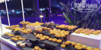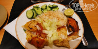 На обед сперва ходили в основной ресторан, с пляжа идти минут 10. Мы случайно зашли в ресторан на пляже и там всегда далее стали обедать. Очень хорошо в жару обедать под кондиционером, да и идти 5 минут. Ассортимент небольшой, брали салат, рис, подливку, супчик и фрукты. Шаурма на входе с курицей мне не очень, мясо сухое, булка жёсткая. Там же можно взять мороженое, пиццу и очень вкусный кофе.