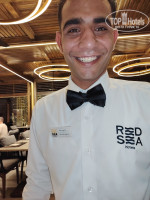 На ужине нам удалось удачно сесть, мы попали в зону действия Али (см. фото) Очень вежливый и общительный, мы с ним познакомились, он узнал наши вкусы, и с тех пор нас всегда ждал приготовленный стол с любимыми напитками (мы всегда приходили к началу, не задерживаясь). Помогал и на завтраке и на обеде, если пересекались.