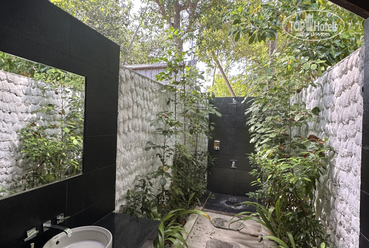 2. Номер. У нас было 2 номера 106 и 119. Мы 3 дня прожили в 106, так как наш 119 почему-то оказался занят (платили мы именно за него). Оба номера хорошие, всё есть, вода/пополняется, чайник, чаи/кофе, мини-бар платный, удобная кровать, хорошая мебель, шезлонги, тапочки, сейф, халаты, полотенца, номера очень просторные, тропический душ прямо на улице под банановым деревом. Номера хорошие, 106 - сразу терраса уходит в океан,поэтому в неё постоянно бьётся вода, шум, особенно ночью, поэтому мы и хотели жить в 119, так как там номер от океана разделяет песчаная полоса и ночью его не так слышно. К номеру претензий нет, особенно к 119 (свой вход в океан, свой бассейн, деревья, лежишь и кайфуешь). Но вход в океан - просто беда, убьёшься даже в аквасоках, я уже не говорю о том, что камни там чертят по пузу даже в прилив, а в отлив я туда вообще не заходила.