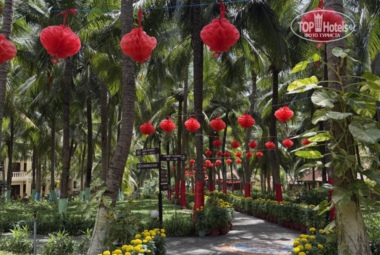 Далее территория. Это конечно тропический рай. Очень чисто, зелено, все в кокосовых пальмах и разнообразных цветах. Еще мы попали в ТЕТ, это вьетнамский Новый год, все было украшено фонариками и сделана отдельная фотозона. ( фото добавлю). Чистые бассейны, их два, и при том, что отель был загружен, место на лежаках всегда можно было найти.