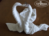 Обслуживание: персонал вежливый, быстро реагирующий на просьбы,стараются помочь, уладить,чтоб туристу было комфортно.Уборка в номере каждый день, постель и полотенца менял уборщик ежедневно.Накрутил лебедей и сердечко с лепестками. Всегда приносил свежую воду в фабрично запакованных бутылках. Однажды- букетик цветов нарвал.Из живности никого не было.Один раз муж нашел крупного муравейчика в ванной(сын отпустил его гулять с нашей веранды на первом этаже).В последнюю ночь комарик один летал.Видимо, уборщик не отравил.Каждый день оставляли чаевые в номере по 1д.