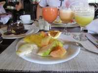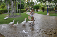 Итак, решила тоже поделиться впечатлениями об отдыхе в Доминикане, в частности в этом отличном отеле! Перелет Трансаэро (не задержали-удивительно) 11 часов страха и ты в лете (на самом деле нормально прошло, ожидала что будет хуже). Приезд в отель - встретили отлично, номер дали в трех корпусах от моря, то есть очень близко. Правда номер на первом этаже, зато с ремонтом, с джакузи, с огромной кроватью и плазмой. Еще понравилось то, что была кофеварка и кофе! Очень мило было попить кофейка после дневного сна)) Главный ресторан очень большой, правда до него пехать где-то 1,5 км от моря, но это даже приятно. кому жаль свои жиры и ноженьки могли ездить на паровозике. Лично меня эта езда бесила, но ездить пришлось второю половину отдыха, т.к. были ливни и заливало середину отеля (где был заповедник с животными, вот они там нарадоваться не могли) Каждый день в главном блюда различных кухонь, Французский вечер с сырами, даже с моим любимым сыром с плесенью!)) Вино пили белое-вполне нормально. В лобби понравился коктейль не помню как называется, голубой такой с соком лайма. Рестораны аля-карте просто супер! Была в других дорогих отелях разных стран, но аля-карте понравились именно тут! Обслуживание, все в своей теме! сначала очень понравился Эль Пискадор со своими лангустами и др. морскими гадами. А потом подсели на Белла Паста, там был доп. буфетик с нереальным мясным карпачо! и вообще любые макароны у них вкусные. Да! про завтрак - смуси из папайи, ананаса, банана, дыни -очень вкусно, только бесило что немного водой разбавляли. Свежие ананасы-это чудо! у нас такие не продаются-сладкие как мед! В обед давали всякие там мидии, ракушки, устрицы))) Понравилось кормить уток и гусей, павлинов - все берут из рук! а еще хищные птички ловят на хлебушек рыбу- зрелище веселое!)) А в заповеднике сидят огромное кол-во черепах, попугаев и всяких др. птичек. Природа там просто ваааах!!! Территория отеля нереально красивая, большая. ухоженная, садовники дают кокосики прямо с деревьев! Лежаки не очень, но мы мало лежали, основном гуляли в доль пляжа по беленькому песочку. Океан волнистый, прыгать на волнах очень весело. А! Съездили на экскурсию ВДВ-приключение. Ну для разнообразия ничего, а так-ничего особенного - смешанная экскурсия, с кубинцем, который служил в Рязани в ВДВ))))) Поводил нас по злачным местам (вонючим рынкам), также сходили в католический храм, потом погуляли в парке, покатались на лошадках, попили какао на плантациях, постреляли в тире из боевого оружия (за доп. плату - 100 евро 15 пуль полый магазин) Ну вообщем не плохо. Кто занял 1 ое место по стрельбе получает бутылку Мамахуаны)) Это была я!!! ))))) Ребята, на счет отеля - отбросьте все сомнения. Только туда!!! Я не любитель возвращаться в одно и тоже место, но если еще и поеду в Доминикану, то только в этот отель!!! Всем удачи и приятного отдыха!!