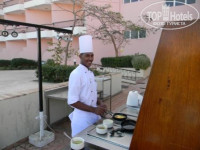 Питались в главном ресторане (был еще один итальянский, но как сообщил нам гид, ужин там накрывают периодически...нам в него попасть не довелось((( ). Питание очень разнообразное и вкусное. Перед входом гриль-бар на свежем воздухе. По утрам там готовили блинцики, пончики и яичницу. Днем и вечером макароны и что-нибудь мясное (котлеты, курица, рыба, крабы). В последний вечер на вертеле жарили ламу и было что-то вроде шаурмы. Очень много разных салатов и сладостей. Торты вообще обалденные!!! Из фруктов были апельсины, финики, груши, яблоки, бананы и дыни (правда немного зеленые). Кроме главного ресторана был еще ресторанчик на крыше. Там круглосуточно можно было перекусить (пицца, гамбургеры, картофель фри, салаты). Бар на пляже работал с 10 и до заката. Один раз там раздавали мороженое (бесплатно). Вцелом питанием остались очень довольны. Хотя для любителей мяса, может показаться выбор не очень большим.