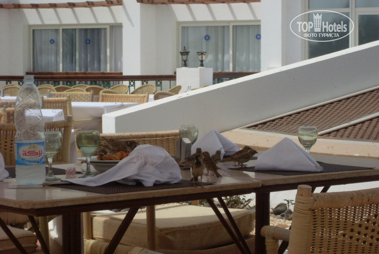 2. Ресторан. ни когда не сталкивались с такой проблемой, как ОЧЕРЕДЬ в ресторан. Отель расширяется, строит новые номера а ресторан не вмещает всех желающих. В ресторане нет русского говорящего администратора, официанта. Грязная посуда, они вообще не моют посуду а споласкивают. На открытой террасе на море постоянно питаются воробьи, это конечно красиво, но столы и стулья всегда грязные (тем что съели эти воробьи), так что испачканную одежду вам придется после обедов и ужинов стирать(((. Пепельниц катастрофически не хватает на балконе, люди сперва ловят официанта (которых на два зала только 4 человека), а потом по 15 минут ждут пепельницу. не дождавшись курят, а бычки складывают в грязную посуду. Вид конечно не вызывающий хорошего аппетита.