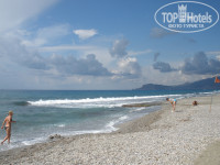 Пляж немного грязноватый. Лежаки, зонтики и матрасы бесплатные. На пляже бабушка печет вкусные лепешки с зеленью, с сыром и картофелем. Вход в море неудобный, кааменистый, с детишками опасно. Люди покупали себе резиновые тапочки. А мы заходили с пирса, там вполне безопасно. Море чистое и прозрачное.