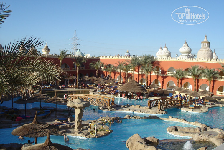 И так туроператор Тез тур , перелет до Хургады Таймыр (NordStar Airlines), ничего плохого сказать о перелете не могу, все нормально, встреча в аэропорту прошла хорошо, таможню прошли быстро, так как народу было немного, не как в том году. Рассадили по автобусам и в путь, до отеля с заездом еще в три ушло где то около 30 минут и вот мы в очутились в сказке, отель очень красивый за все полных 5 дней мы его не весь посмотрели, не видели шахмат , так как дошли только до немецкой деревни, дальше не ходили, да и времени не хватало, утром на море, вечером на бассейны , а там и скоро темно. Об отеле очень много сказано и написано в отзывах, он очень большой и красивый ,на территории постоянно что то убирают, моют , поливают цветочки, на первой линии столько всего не построишь, то что это вторая или третья , как пишут люди линия нас не смущало нисколько,номера хорошие , но не большие, мебель старовата, но ничего не сломано, при заселении дали 20 долларов и нас поселили в 6 корпус в номер 625 сказав , что вид из номера очень красив, вид правда хороший , но в 15 часов начиналась анимация на бассейне и тихого часа после обеда у нас не получалось, в номера был бесплатный сейф, в ванной фен, уборка номера была замечательная, правда мальчик который убирался, плохо понимал по русски, но мы с ним почти что не общались, так как все было безупречно, холодильник всегда был забит бутылками с простой водой. Есть два российских канала, первый и россия через украину. Что касается питания , то в этом отеле все с этим нормально, в Гранд Плазе с этим было хуже, овощей много, есть супы на обед и ужин, десерты очень вкусные, соки Юпи, пиво и вино трех видов, красное, розовое и белое. Ходили в Морроканский ресторан все там показалось очень острое, в главном нам понравилось больше. Вечерами гуляли за территорией, там очень все красиво. В магазинчике при выходе из отеля покупали у Миши пакетированный сок и клубнику, очень люблю сок гуавы. Ходили на шоу 1001 ночь, ничего пару раз посмотреть можно.