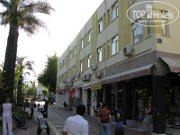 расположен в центре, наши окна выходили на торговую улицу, до моря идти квартала 4 (проходятся легко и быстро учитывая количество разнобразных лавок и магазинчиков..), там бесплатные зонтики и шезлонги, участок отеля на пляже под номером 155, почти вплотную к бухте с яхтами. Напротив отеля полицейский участок.
