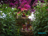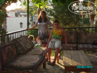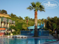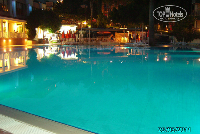 Ездила с 22-29.05 мужем и детьми 13л,1,11мес.Туроператор Пегас,авиакомпания Норд Винг вылет в 4 утра.В отель приехали где-то в 10 часу.Одели браслеты и сказали ждать до 14ч.Мы переоделись и пошли на пляж.Пришли около двух и нам дали номер.Бронировала стандарт,а нам без доплат дали фемели на 1эт около ресепшена на горке.Вечером не слышно зато музыки и у бассейна номера сырые на 1 эт и низко музыку слышно.Везде дорожки под коляску удобно кто с маленькими.В отеле одни русские,отель забит на 100процентов.Стыдно смотреть на наших как они набирают целые тарелки,что даже валиться,а потом персонал убирает недоеденную еду со стола.В ресторане образуются очереди,а если придешь позже то может не достаться ни тарелок ни ложек.Детская площадка маленькая мини-клуб с 4-12лет.Территория вся в цветах все благоухает везде ухаживают и поливают.В отеле есть мини-зоопарк(павлины утки кролик) и много кошек.Завтрак в главном ресторане с 7-10ч,обед с 12.30-14ч,ужин с 19-21ч.Днем в террассе-кафе пекут блины с сыром с 17-18ч печенье.Около бассейна вкусные пончики и трубочки с сыром.Теодора бар напитки до24ч.По утрам свежев.сок за 2 дол.(5 разных вкусов).В отеле есть интернет-кафе можно выйти в интернет 6 дол.за час.Сын играл в приставку 4 дол пол часа.Сувениры можно в отеле приобрести цена такая же как на базаре.Базар в 15 мин ходьбы есть привозной во вторник и пятницу мы так и не сходили там дешевле.Клубника на рынке 3 дол.Таксофонная карта стоит 4-5 дол хватает минут на 14.Муж с сыном катались на парашюте 70дол.Фото в отеле дорого 5дол,ноеслиберешь много делают скидку.Муж взял 11 шт за 40дол,больше не скинул.Слева от пляжа гора мы ходили фотографироваться очень красиво.Мелкая галька с песком с детьми хорошо.Для маленького брала кашку пару банок пюре и сок.Там не пил юпи и газированную,только из бутылок.1раз в неделю можно записаться на ресепшене в ресторан.Мини-бар пополняется 1раз в неделю.Пляжные полотенца и сейф под залог 10дол за каждое.Семейный отель много детей.