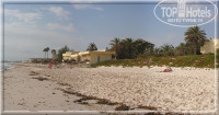 После отправились осмотреть территорию, море. Территория пусть небольшая , но достаточно приятная для глаз, чего нельзя сказать о пляже. Картина маслом: перед входом в море большой редут из водорослей, которые прибило щтормом, за предшествующие три дня. Естественно «аромат» от этого витал соответствующий, но вода в море достаточно чистая, хотя не без мусора. Пляж пустовал, видимо сезон начинается позже, да и постояльцев немного. Лежаки на пляже платные, цену не спрашивали, потому что использовали отельные полотенца. На пляже есть бар, но он тоже платный: бутылка пива 0,33 – 2,5 тд , кола 0,33 – 2 тд (тд - тунисский динар, равен 23 руб.). Там ещё горячие блюда предлагаются, но цены не уточнял, незачем. Правда бар открылся только 1 или 2 июня, до этого был ремонт. Но работающий персонал вежливые и приветливые.