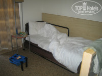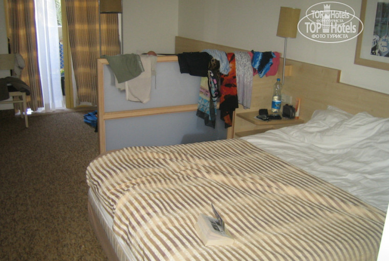 Обещание портье ссдержал. Переселили на 2 этаж, номер в принципе, такой же, на полу ковролин, перегородка низкая - где-то по пояс.За ней на кровати и спало наше чадо. Вид был на соседний отель и справа было море видно - такой боковой вид, что называется. Но после подвального этажа это показалось раем. двуспальная кровать, телевизор,тумбочки, холодильник, приличный шкаф для одежды, сейф БЕСПЛАТНЫЙ. есть за перегородкой дополнительное место для ребенка. Прочитав предыдущие отзывы, стало понятно, что на этаж "минус один" заселяли почти всех в этом корпусе))))