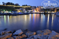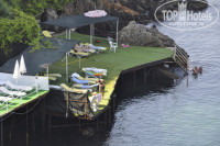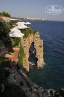 Прежде всего, описание отеля не до конца соответствует действительности. Песчаного пляжа и близко нет. В данном месте очень скалистый берег и крутой спуск, так что его там в принципе не может быть. Есть платформа в довольно запущенном состоянии: шатающиеся доски покрытые сверху видавшим виды ковровым покрытием, несколько шезлонгов. До центра Анталии далеко не 3 км, как написано в описании, а около 6 (в чем легко убедиться по карте).