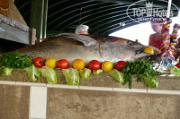 Территория отеля зеленая, очень ухоженная. Питание, повторюсь, хорошее, но день на пятый – шестой все приелось. Дочка ела вообще немного, в отличие от того, как хорошо кушала по приезду. Кстати, под конец нашего там пребывания еда стала менее разнообразная, а может, сначала этого просто не замечали. Мясо можно найти всегда. Гуляш, запеченное мясо или жареное. Курица и индейка также были в достатке. А вот рыба мне не понравилась вообще. Единственно, когда вечер турецкой кухни на улице запекали большущую рыбу на гриле (см. фото) – она была очень великолепна. Даже дочка, которая рыбу вообще не ест, кушала ее с удовольствием. Из ресторанов аля-карт работал только турецкий и рыбный. Ходили в турецкий – не впечатлил. Холодные закуски напоминают домашние заготовки на зиму (у мамы вкуснее), салат - мелко порезанные огурцы, помидоры и перец, какая-то лепешка с такой же заготовкой только запеченной (фу), горячее - шашлычок и на сладкое та же пахлава, что и в обычном ресторане (только в обычном она почему-то вкуснее). Лучше уж в обычный ресторан сходить и выбрать еду себе по вкусу.