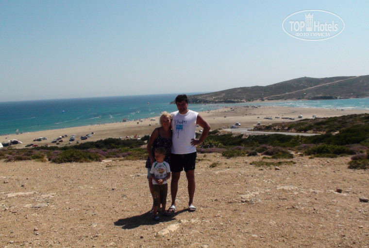 Поцелуй двух морей . Ездили самостоятельно. Эту поездку можно совместить с поездкой в Линдос. Самая южная точка острова. Как появятся ветряки нужно смотреть поворот на Prasonisi. Мы ездили туда два раза. Первый раз как раз после небольшого шторма на море. Сильный бриз и высокие волны со стороны Эгейского моря очень развлекли. Напрыгались на волнах вдоволь. Средиземное море в этом месте по сравнению с ним это пруд. У самой южной точки, где сливаются два моря и волны идут навстречу друг другу вода просто кипела и бурлила. Это обязательно надо видеть. Интересно понаблюдать за серфингистами и парапланами. Приехав через два дня, мы застали картину несколько иную. Ветер был не так силен, волны не очень высоки и тд. и тп. К тому же приехала куча туристических автобусов. Пробыли мы там около часа и уехали на западное побережье купаться. Парковка удобная, только не стоит заезжать далеко, там где песок не спрессован, а мягкий. Очень много машин вязли там. Сами несколько раз помогали горе водителям.