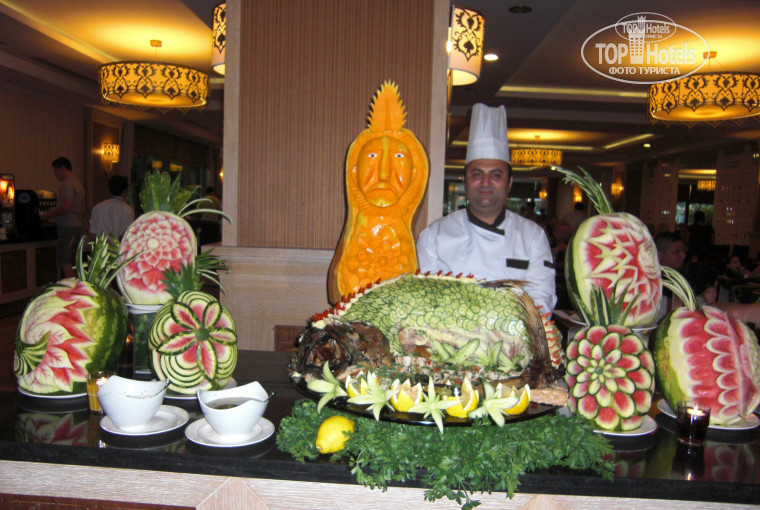 Питание: очень достойное, есть мясо(говядина, индейка, курица - всегда), рыба, мидии, креветки, фрукты (арбуз, дыня, персики, абрикосы, нектарины, черешня, яблоки, апельсины, сливы)не говоря обо всем остальном. Свежевыжатый сок 2 года назад был бесплатно (сами выжимали), в этом году платно.Персонал в ресторане работает быстро. Часто на обеде и ужине присутствуют хозяин отеля и управляющий.Мороженое с 14:30 до 16:30 - рядом с Мини-клубом.
