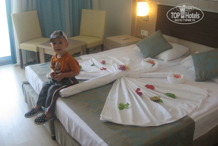 РАЗМЕЩЕНИЕ: Приехали мы компанией 8 человек,из них 2 ребенка 2,5 и 3 года. В отель прибыли часов в 9 утра. Заполнили бумажки, надели браслеты, предложили пройти на завтрак. После завтрака подъехал наш гид от Анекс-тур Малик, пообщались с ним, он в свою очередь передал наши пожелания товарищам на ресепшн, они по русски не говорят. 20$, ускорили процедуру заселения, часов в 10 мы уже были в номерах в главном здании, т.к. покупали стандарт без определленного вида из окна, предупреждали, что как повезет, где будут номера туда и поселят, вероятность анекса была 50%, но нам повезло. Если кто будет покупать тур в анекс-рум, предупреждение: рядом с отелем городская дискотека как раз рядом с корпусами анекс, долбит музыка до 4 утра. Так что кто собирается ехать с детками задумайтесь, т.к и в основном здании музыку слышно, если открывать балкон. Номер у нас был 1324 с видом на бассейн, все новенькое, чисто, белье меняли раз в 3 дня, а иногда и чаще, обратила внимание, ребенка мазала зеленкой, ну и покрасили чуток бельишко, поменяли тутже. Полотенца тоже меняли очень часто. Воду оставляли каждый день, даже в дни когда не уберались, по нашей инициативе, все равно воду заносили.