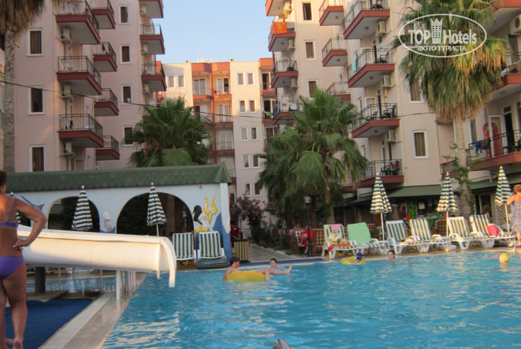 Первое впечатление об отеле- неплохое...Хорошая территория, уютный бассейн, на ресепшене- рускоговорящие. НО Поселили в ужасный номер- на первом этаже под № 1403! (обещанных балконов там не было), в ванной вода стоит 3 см , ужасный запах сырости, естественно полотенца и купальники не просыхали....на мою просьбу переселить- отреагировали только на третий день...и вобщем то поселили в неплохой уютный номер на 4 этаже с 2-мя балконами (пару долларов творят чудеса)!!! Первые дни бармен был обходительным , но после того как я не согласилась с ним прогуляться - начал вредничать....Питание - на любителя (лично я первые 5 дней вообще есть ничего не могла) мясо отсутствует напрочь, пару раз кормили рыбой, но в основном БАКЛАЖАААААНЫ, хотя пиво в баре - неплохое)))). Пляж действительно не далеко (через дорогу). Приходилось постоянно перебегать скоростную трассу (с детьми опасно). На пляже лежаков всегда хватало, но вот заход в море ужасный (резкие обрывы- опять же с детьми опасно!, да и взрослым -- если плавать не умеешь- хана!) . Бара на пляже нет...только вода и какой то разбавленный юппи)))). Молодёжи в отеле мало, в основном семейные пары с детьми и люди прелонного возраста. мы даже прозвали этот отель - пансионат)))) Анимация - так себе....вывозили на дискотеки в Аланью за 6 баксов, днём - пляжный волейбол, дартц, аквааэробика, вечером - мини диско для детей и какой- нибудь конкурс для взрослых. Скучновато!!! В целом - если в отеле не сидеть , а выбираться на экскурсии - отдых получиться не плохой! Но второй раз я б туда не поехала.