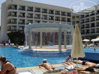 Территория отеля средняя, но не маленькая. Кажется 2 га. Несколько бассейнов. При чем здание стоит в форме креста и получается, что бассейны разделены на зоны. Есть более тихая, где отдыхающие лежат в тишине под пальмами и релаксируют. А есть центральный большой бассейн где проводилась анимация и всегда играла музыка. Есть горки, проводились игры и т.д.