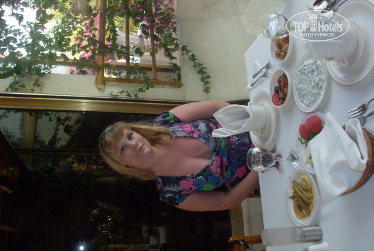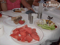 Питанее хорошее, на любой вкус.на завтрак йогурты,молоко, каша, картошка жаренная и пюре, колбасы сыры, салаты,выпечка разнообразная, фрукты.На обед рыба, курица, индейка, сладостей всяких всевозможных полно, арбузы, дыня, персики, слива, банан,грейфрукты, апельсин.на ужин баранина или рыба на гриле и мясо индейки и курица.одним словом все хорошо.Ходили в рыбный и в турецкий ресторан, но после изобилия в обычном ресторане не очень впечатлило.Обслуживание в ресторанах хорошее все напитки приносят офецианты, очень добрадушные мальчики и девочки (чувствуется, что им дали наставления все делать на высшем разряде, что очень приятно)Напитки в любом количестве и на любой вкус и в баре и в ресторане.Еще пекли замечательную пицу, лепешки с всякой начинкой и мы наедались так, что не хотелось идти обедать.