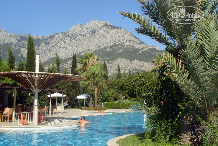 Территория как многие писали не большая,но это совершенно не мешает отдыху.Большой бассейн,много зелени,замечательный вид на горы,водные горки,настольный теннис и что очень удобно-душ у бассейна.