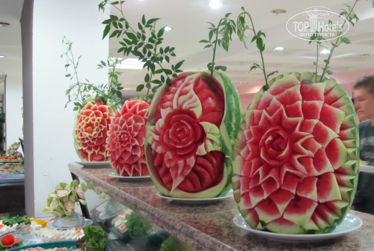 Контингент отдыхающих разный: много молодежи, семьи с детьми, пары, компании. Из иностранцев были поляки, голландцы. Обстановка дружественная и доброжелательная. Еда разнообразная, вкусная и очень много. Работает шеф-поваром замечательный молодой парень – Атилло. К своему делу относится творчески. Почти каждый день поражал всех фигурами, вырезанными на арбузах и тыквах, а по воскресеньям показывал как они делаются – карвинг-шоу. Давали курицу, рыбу, печень, индейку, баранину, котлеты, сосиски, долму, мясной рулет, разные салаты, зелень, овощи свежие и тушеные, сыры, супчики протертые и даже русские щи, солянку с оливками, детям – каша.
