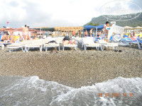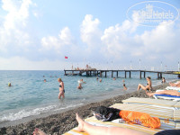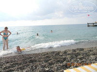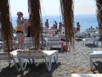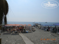 Пляж расположен в 150-200 м. от отеля, но это не напрягает абсолютно, так как прогуляться до него просто удовольствие. Дорога на пляж проходит вдоль другого отеля по аллейке. Сам пляж хоть и небольшой( по ширине), но мест всегда хватало всем и проблем вообще не было никаких. Хоть под солнцем можно было расположиться, хоть под навесом. Не надо было бежать и с утра занимать место на пляже, как это было в соседних отелях. Море-красота. Чистое, галька, вход хороший. На пляже нашим отдыхающим разносили прохладительные напитки ( кола, спрайт, фанта, вода, пиво), чему отдыхающие других отелей завидовали.