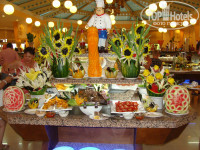 Очень разнообразное. Правда, такие фрукты, как персики, абрикосы, сливы - были недозрелые. Мяса достаточно, есть, конечно, и соевое (куда ж без него)), курица, индейка, говядина. Много салатов (я, честно говоря, их не ем), предпочитаю брать всё по отдельности. Огурцы, помидоры, разные солёности, свежая зелень, оливки, маслины, арбузы, дыни. Каждый день давали очень крупную и спелую черешню. На завтрак йогурты, колбаса, мясо, торты, блины, омлет, яичница. Диетическое меню скудновато, правда: отварная курица, отварная рыба, варёная картошка. Вкусные булки ))) И вообще, по всей территории отеля разбросаны кафе и питание с 7 утра до 7 утра. Детские стульчики в зоне детского питания. Официанты быстрого реагирования ))) Ты можешь не успеть доесть последний кусок - они уже забирают тарелки ))) Везде, кроме основной столовой делают хот-доги, шаурму, пиццу и т.д. Голодными не останетесь ))