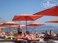 На пляже бесплатные лежаки, зонтики. Вход в воду удобный, по гальке можно ходить и без шлёпанцев. Вода такая чистая и прозрачная, что около буйков можно увидеть, что блестит на дне. Там же, около буйков, плавают черепахи.