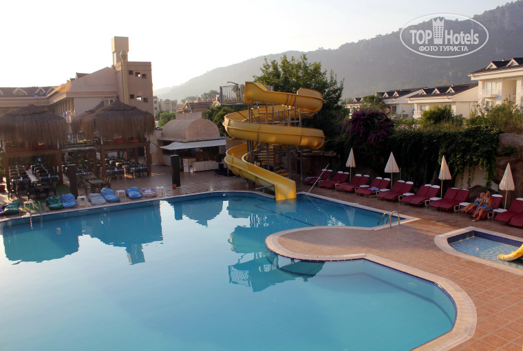 Бассейн в отеле не очень большой но есть горка которую включают 3 раза в день. Бассейн якобы запускают на хлорирование после 7 вечера, но я один раз купался в 2 часа ночи и разницы не почувствовал.... Горячая вода есть в течение дня. Некоторые пишу что ее нет. Наверное они проверяют ее наличие в 2 часа ночи )) В южной турции нет специально нагревающих воду бойлерных. Вода нагревается солнцем на крыше в специально установленных бочкахи радиаторах. Поэтому к ночи ее просто полностью расходуют.