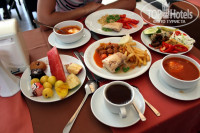 Первые блюда - русская солянка, борщ, и пару видов турецких крем- супов. Вкусно. По утрам на завтрак были оладьи, блинчики, яичница. По вечерам иногода вареная кукуруза.