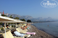 Пляж чистый, галечный, лежаки и зонты бесплатно. Пляжные полотенца тоже бесплатно можно взять под залог (10 баксов. При сдаче номера вернут деньги) Пляж достаточно большой, лежаки найти можно.