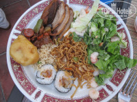 3) Еда менее разнообразная, по сравнению с турцией, но все очень вкусное. Всегда фрукты, салаты. И есть можно все (например в турции половину есть нельзя вообще. Либо остро, либо кисло.) Мяса полно разного в любых видах: жареное, пареное, гриль, вареное. Тоже самое и с рыбой. Еще в греции попробовала самую вкусную рыбу в своей жизни. Лосось с медово-горчичным соусом. Безумно вкусно. Ужинать рекомендую на террасе. Там приятней. На обед понравилось ходить в альбатрос. Целый день можно есть мороженное. Так же на обед и ужин есть супы.