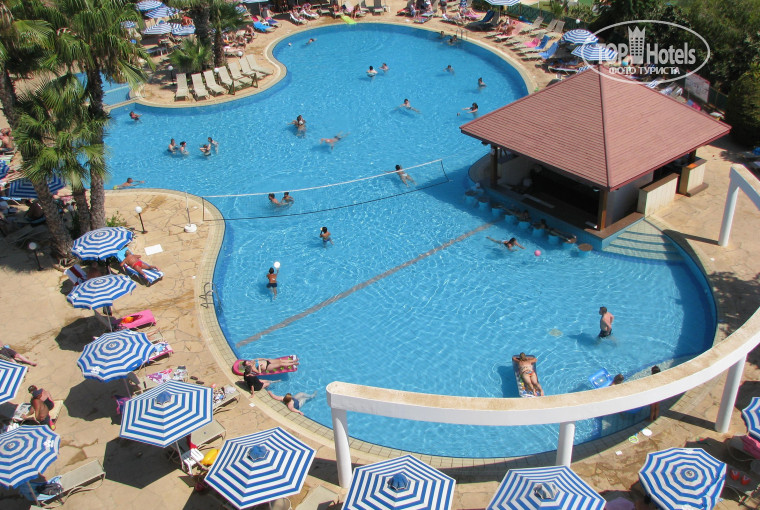 Бассейн (на фотке) чистый, понятно, что хлорированный. Насчёт моря в 200 метрах – это, наверное, по азимуту? До моря идти вниз минут 10, но нам было не напряжно. На пляже всё платное (зонт и лежак – 5 евро). С 13 до 15 часов находится на солнце вообще нереально да и нежелательно. Разницы во времени с Украиной нет!