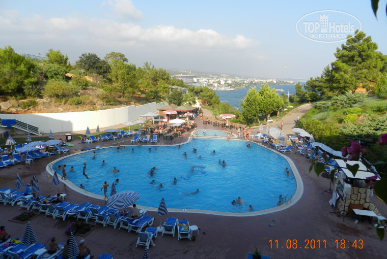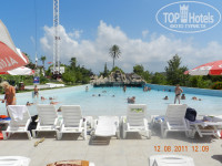 ТЕРРИТОРИЯ, АКВАПАРК: Территория отеля большая, совмещена с территорией аквапарка. Отель находится на горе, поэтому всегда идешь вверх-вниз. Территория очень красивая, чистая, ухоженная, много зелени : сосны, пальмы, различные кустарники, цветы! А вид на море сверху просто обалденный!!! Много бассейнов, но только для посетителей отеля всего один, около главного корпуса. Там проходит и дневная анимация. В остальных бассейнах тоже нормально. Есть бассейн с искусственной волной (пускают в 12 и 14 часов). Около этого бассейна стоит подъемный кран с тарзанкой, при желании можно прыгнуть (40 долларов). Есть большой детский бассейн , в нем много детских горок. В диско-баре ежедневно в 15 часов проходит пенная дискотека - очень прикольно! И ночная дискотека тоже там (на нее платно привозят еще и гостей других отелей, а для гостей нашего отеля - бесплатно, только напитки платно). Есть искусственный рафтинг (платно), но это, скорее, детский вариант. Горки классные! Кто любит - тому понравится! Еще плюс, по-сравнению с другими отелями, горки обычно по часам включают, а тут , т.к. в аквапарк работает сам по-себе, принимает гостей со стороны, горки работают без перерыва с 10 до 18ч. Конечно, днем много народу, очереди на горки, но если захочешь - постоишь, прокатишься! После 16 часов народ разъезжается и кататься можно свободно. Лежаков на территории много: у всех бассейнов, около горок - т.е. если нужно - всегда найдете свободный лежак. На территории аквапарка есть магазинчики, сувенирные лавки. За территорию ставлю 5+! Еще, за территорию отеля особо выйти некуда, т.к.отель на горе. Можно спуститься с горы по дороге (но это мин 20-30 , думаю), у подножья горы магазинчик, а чуть дальше пройти - рынок.