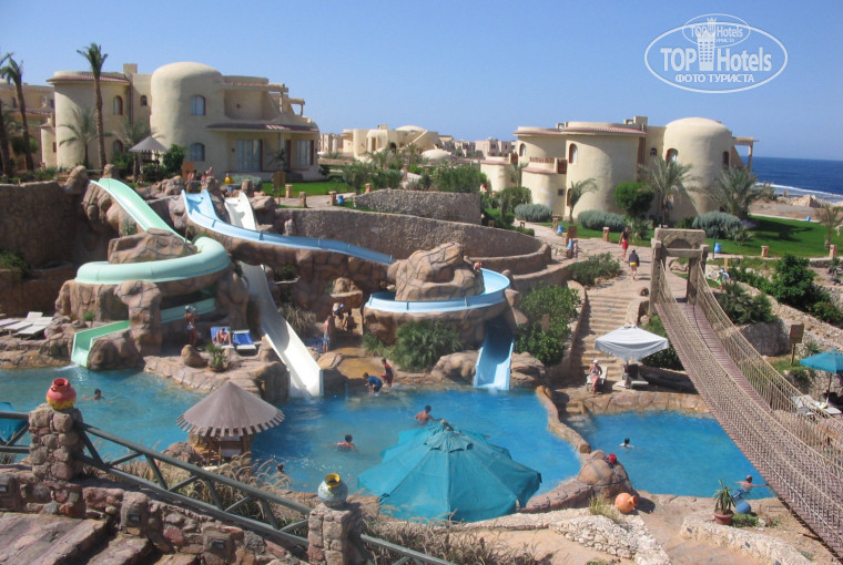 Отдыхали в начале июня 2006г 2 взр + 2 мальчика 7 и 9 лет. В целом - очень положительные эмоции! Кто с детьми - туда не пожалеете! Главный козырь - отличный пляж. Для Египта это очень важно. Песчаный берег, по щиколотку уже плавают прикормленные рыбки и едят прямо с рук! Ежи морские как на ладони, морская цапля, даже мурена маленькая приплывала. А по периметру кораллы со всем подводным микромиром. Там не страшно плавать с маской самым малым, да и родители всегда подстрахуют. Потом - горки. Их 3 и они разные. Наши на матрасе с ручками неслись с белой горки так, что от скорости и счастья орали на весь отель и окружающие им в этих эмоциях только завидовали! Купались сутками то в море, то в бассейнах, с перерывами на еду. Кстати, жара была +46 говорят. А мы не сгорели ни разу (после 12 конечно в футболках, не психи же ) и не почувствовали пекла, такой климат. Есть услуга "Завтрак в зоопарке". Это когда абсолютно всех животных (а там лама, дикобраз, страусы, лошади, козы, обезьяны, черепахи, и пр. пр.) можно покормить с рук, сфотографироваться в обнимку ( (конечно, безопасность продумана). Вы видели когда нибудь дикобраза стоящего в стойке и просящего хлеб? А мы там видели. Еда не богата, но всегда выбор есть. А как готовят пасту для детей! Да они готовы 2е порции съесть за то, что внимательный повар будет до мелочей выслушивать какие макароны и с какой подливкой и т.п. они хотят! Все официанты с детьми играют, а у взрослых запоминают напитки и несут завидев вас без доппросьбы. Улыбайтесь только благодарно. Тут читаю вот отзывы, что многие накладывают горы фруктов. Скажу честно я тоже их таких. Ну не хочет мой отпрыск есть фрукты тут же после еды! Ему на пляже вкусно да в номере вечерком подавайте!!! Вот и приходится приспосабливаться! Про напитки не буду врать, практически не брали, своё было. Номера и территория оформлены в африканском, искусственно потертом стиле. Мы осмотрели 3 номера ночью (от 23 до 1) и терпеливые портье с носильщиками возили нас на смешном автобусике пока мы не остались довольны номерами. А те сами предложили пацанам посидеть рядом с водителем и рулить. Номера убирали ежедневно, все работало исправно. Телефоном пользовались. На массаж постеснялись идти, т.к. местные мужчины к русским женщинам «не ровно дышат». Но раз в неделю массаж б/п, входит во все включено. На пару экскурсий ездили. Предостережение во время поездки на субмарину – при входе на судно КАЖДОМУ входящему на голову оденут шляпу с символикой. Судно потихоньку выходит в море и сидите вы на верхней палубе на солнцепеке. И думаете уже было, ё-маё как все продумали про головной убор, какие молодцы! мы ведь сгорим тут на открытом солнце! Но нет! Через пару минут с вас начнут собирать денежки за эти панамки. А как только соберут – тут то вас и пригласят на дно лодки!! Ну в самом то деле ехали на подводную экскурсию! И больше эта панамка вам не понадобится. Вот так там зарабатывают арабы деньги. От города впечатление осталось не ахти, грязновато, все за руки хватают, брррр! Дети были в ужасе, но это тоже можно сказать впечатления от поездки.
