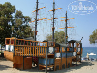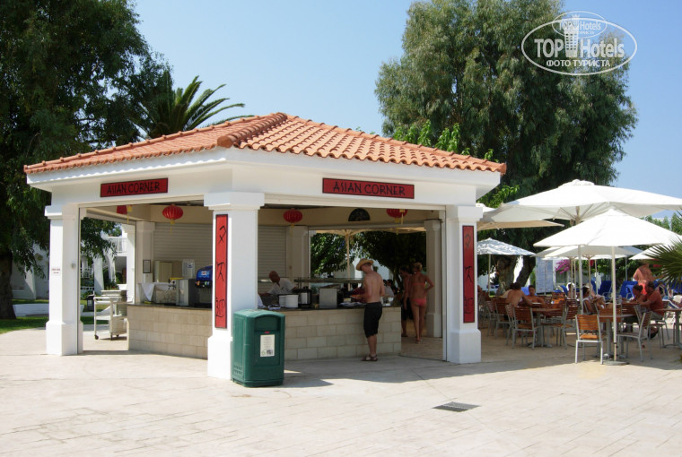 Территория отеля средняя, хотя на фоне рядом стоящих - большая, но хотелось бы больше зелени, хотя ее вроде как там тоже не мало. Если стоять на берегу пляжа лицом к отелю, то по левую сторону вдоль пляжа есть мостик (перед волейбольным полем), он ведет к тавернам и минимаркету на повороте (больше в размере чем тот что находится через дорогу, но больше продает продуктов питания).
