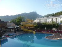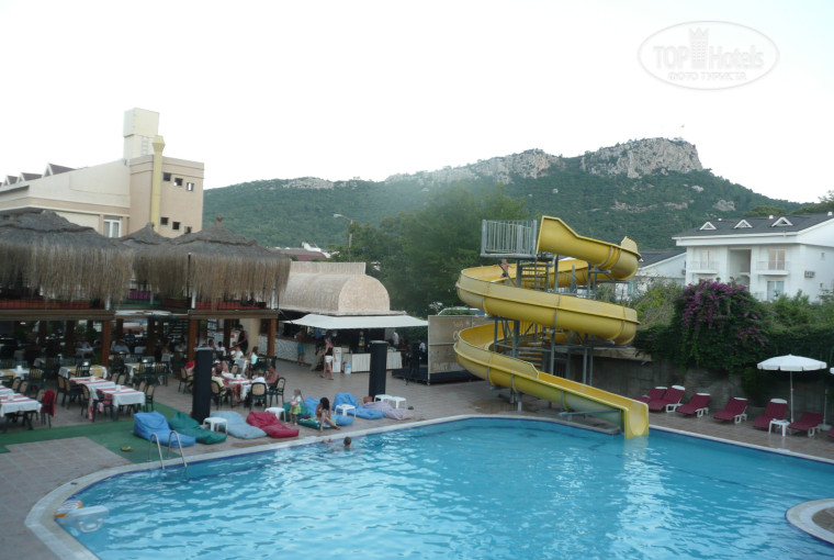 Территория:конечно не огромная,но достаточно хорошая,бассейн, бар, столовая,в бассейне горка-включают три раза в день, с удовольствием катались. Есть бесплатное интернет-кафе, тоже плюс,не тратить деньги на разговоры с родственниками) Сам отель недалеко от центра,можно сходить погулять и днем,и вечером.