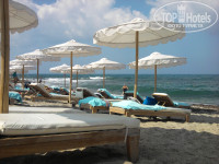 Пляж с прекрасной мелкой галькой, очень комфортной для ног, и хорошим заходом в воду - постепенным но довольно сразу глубоким. Вода чистая. Территория по мне так достаточная - лежаки были всегда. Хотя некоторые и уходили в левую, дикую, часть пляжа, там очень уединенно, хотя вход каменистый.