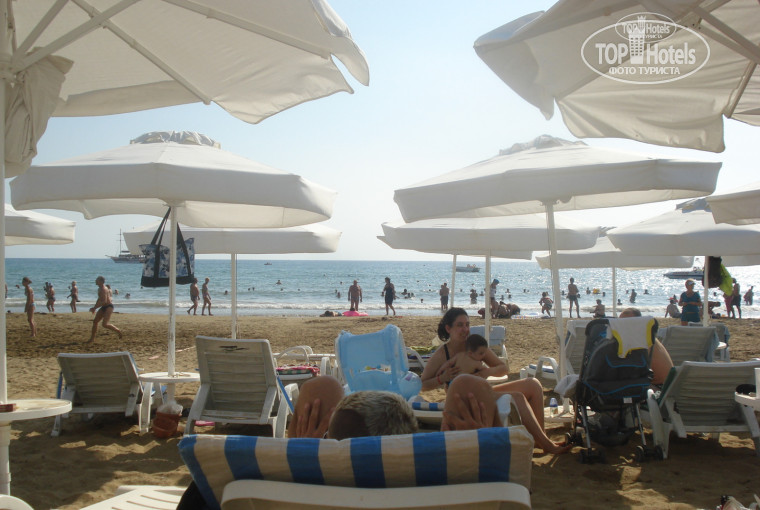 Пляж чистый, песчанный. Вход в море пологий. Мы приходили на море после завтрака около 10 часов и вечером около 16.00. Всегда можно было найти свободные лежаки и мартрасы, иногда приходилось брать матрасы из оставшейся кучи без лямок, а у лежака могла быть сломанна ножка, но нам хватала. Около пляжа находится бара, где всегда можно взять напитки. Там также можно пообедать и в 16.00 получить мороженное.