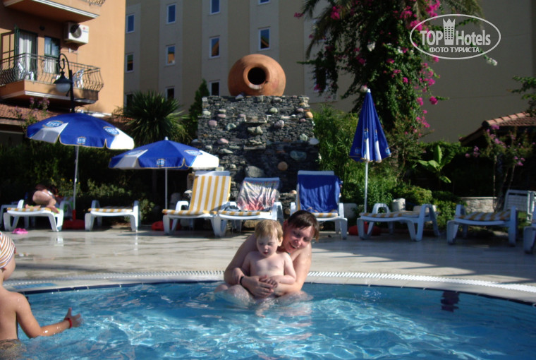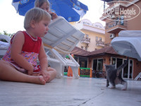 В баре отеля наливали вкусное пиво, которое привозили в кегах и смешно читать отзывы что в этом отеле пиво и водка разбавлены. Из напитков - 7up, меринда, пепси, бонаква. Еще есть подобие соков – разбавленный водой сироп (ice pendos- было написано на тетра пакетах с сиропом). Официанты очень любезные. Дочку буквально на руках носили. Все чисто убирали, мыли и посуды хватало. Пятого сентября произошел конфликт между хозяином отеля и официантами. Одному пришлось уволиться, вроде его звали Асан. Жаль, хороший парень. Стало заметно грязнее по утрам, официанты просто не успевали убирать. По утрам дважды не успели к завтраку заварить чай и вскипятить воду. Это минус хозяину отеля. Ребята старались с утра до вечера. Воду в бассейне чистили при мне раза два и так же заливали не хлорку как пишут некоторые, а специальное средство для бассейнов. В отель с сентября заезжали турки и немцы. По поводу меню нас удивили отзывы, что кушать там нечего!