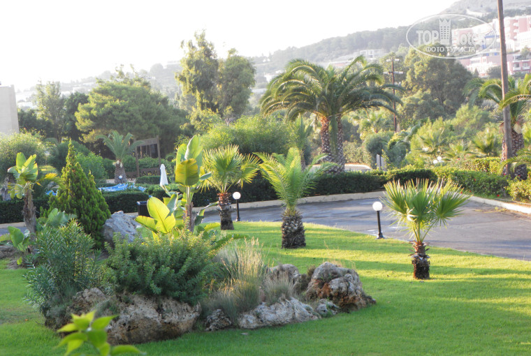 Номер: мы жили в корпусе Диагорас на втором этаже с видом в сад. Номер стандарт с объединенной кроватью на двоих взрослых и за удобной перегородкой две односпальные кровати. У нашего ребенка была практически своя комната. Есть маленький телевизор с тремя русскими каналами, холодильник. Маленький сейф за 3 евро в сутки, в него поместились деньги ))), документы, фотоаппарат и маленький ноутбук. Кондиционер работал исправно, несколько режимов, можно включать при открытой балконной двери.