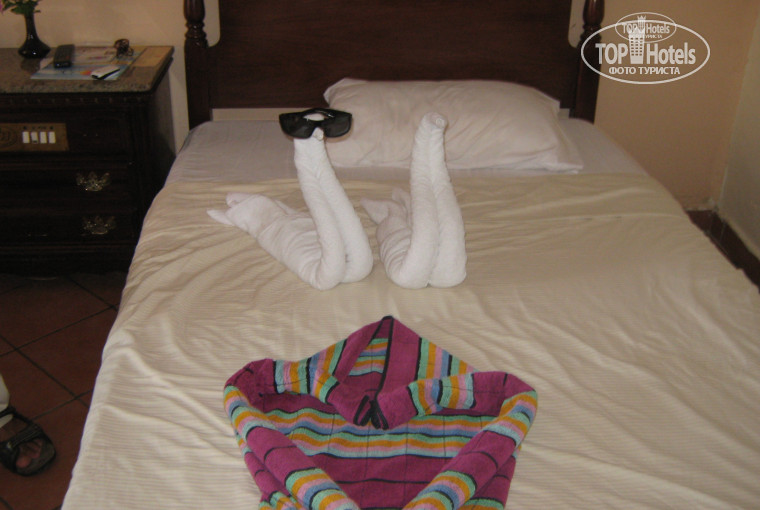 Жили мы в трех этажном корпусе на третьем этаже. Номер просторный, много тумбочек, а в них разные ящички. Мебель не новая но приличная, кровати большие. Был большой балкон с видом на бассейн. Номер убирали регулярно, полотенца меняли практически каждый день. В холодильник каждый день на троих ставили 4 бутылки воды.