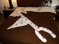 Заселение: Приехали в отель где то в 5 часов вечера, заполнили анкету на рецепшене и нас сразу заселили в номер. Номер дали в бунгало, корпус D, первый этаж с балконом. Вначале я расстроилась, что поселили на первом этаже, но потом как оказалось это даже удобней: можно выйти из номера и через дверь номера и через балкон. Номер очень понравился: двухспальная кровать, большой шкаф, в нем сейф и маленький холодильник, две прикраватные тумбочки со светильниками, зеркало, большой ЖК телевизор на стене, два кресла, кондиционер. ванная комната: зеркало, ванна, раковина, унитаз, фен (везде чисто). Минут через пять принесли раскладную кровать для ребенка. Из номера вид на море и на на основной корпус (Spa салон).