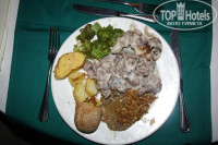 ЕДА была вполне обычная. Не хватало фруктов. Все время лежали зеленые финики (нужно было очень постараться, чтобы найти спелый), и нарезали, либо дыню, либо арбуз, либо зеленые апельсины (такой сорт). Салаты делали себе сами, благо ингредиентов хватало. 2 супа на выбор (один раз был умопомрачительно вкусный суп с морепродуктами). Всегда была говядина (чаще всего гуляш), рыба, курица. Паста, вареные овощи, картошка, рис. С утра 2 вида хлопьев, яйца, нарезанные сосиски, 1 вид сыра, 1 вид колбасы, тосты, сладкое, на улице делали яичницу и омлет ( перец, помидоры, лук. Сыра и зелени не было. Один раз взяла сыр и раскрошила его на глазунью... как ни старался повар сыр не плавился)))). Когда ужин проходил в ресторане у бассейна, 1 раз давали осьминогов, второй раз рыбку. было вкусненько, главное успеть на осьминогов, быстро разбирают, после этого заменяют их на обычное филе рыбки. Бар, на втором этаже работает круглосуточно, там можно покурить кальян ( 2 бакса) (или выйти из отеля налево и там за 1 бакс и вкусное кофе), заказать пиццу (фактически лепешка с сыром и томатной пастой), картошка фри с кетчупом (то вкусная, то не очень, видимо зависит от повара), гамбергеры ( булка, котлета, помидор... если добавить кетчуп, становится более-менее съедобно). Каждый вечер в баре около сцены поп-корн, пятница, суббота, воскресенье -мороженое в 15.00. С утра в баре на пляже булочки с сыром или колбасой (оч. вкусные) и какая-то выпечка. Везде стоят кофейные автоматы и с колой/фантой/спрайтом. тоник (швепс) разливают из баночки.