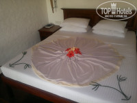 Вот вчера только прилетел домой со Шри-Ланки. Отдыхал с подругой в этом отеле с 24-го Октября по 1 Ноября включительно (вылетали 2-го числа в 4:40 ночи). Отельчик конечно не премиум класса, но плохим тоже его назвать нельзя. Территория небольшая, но чистая и уютная.. У нас был номер Делюкс - поселили в вилле 04 Safrano (2-ой этаж) с балконом, на котором стол и два стула. Вид на океан.. Комната большая, на подьеме в две деревянные ступеньки была расположена большая кровать с двумя тумбочками по-бокам. Сбоку у кровати стол и зеркало большое. Кровать и мебель в номере нормальные. Перед уступом стеклянный столик, плетеный из лозы диван, 2 кресла. Минибар в шкафчике под телевизором (на котором работал всего один канал - ДВД оказался нерабочим..). Шкаф-купе - старенький и ели открывался. В шкафу электронный сейф (работал отлично). Окна боковые очень "подгулявшие" рассохшееся, а металлические элементы поржавевшие.. Но там это не удевительно - очень большая влажность климата. Ванная комната - большая столешница с умывальником по центру, большое зеркало, сбоку фен (фен - ужастен тем, что очень быстро перегревался и нужно было ждать, чтобы дальше сушить волосы)унитаз и дверька в помещение под открытым небом, где расположен душ и джакузи. Также в ванной комнате полотенцесушка на стене (металлическая труба) и подставка для сушки вещей (хотя, чтобы вещи высохли в том влажном климате нужно было минимум 3 дня).