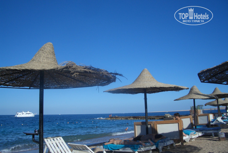 Пляж в отеле маленький, песчаный, полоска воды,отведенная для купания - тоже мала, но потом првыкаешь и все нормально. Глубоко. Лежаки есть, но лучше их занять пораньше, часиков в 8 утра есть выбор. В баре на пляже - автомат с пепси, фантой, минералкой, молоком, водой, есть чайники для чая-кофе. Из спиртного местные водка, ром, виски, джин, пиво, красное и белое вина. Пиво наливают из бутылок, вкус нормальный. Вино сухое тоже из бутылок, тоже по вкусу норм. Вот вискарь и ром только с колой реально пить, ибо в чистом виде - бяка. Бармены, как, впрочем и весь персонал отеля доброжелательны, веселы,не кривятся, бакшиш никто не клянчит. Анимация есть: зарядка, степ аэробика, водная аэробика, танец живота. Аниматоры-арабы. Из минусов - слушком громкая музыка на пляжи во время работы аниматоров. Но это фигня.