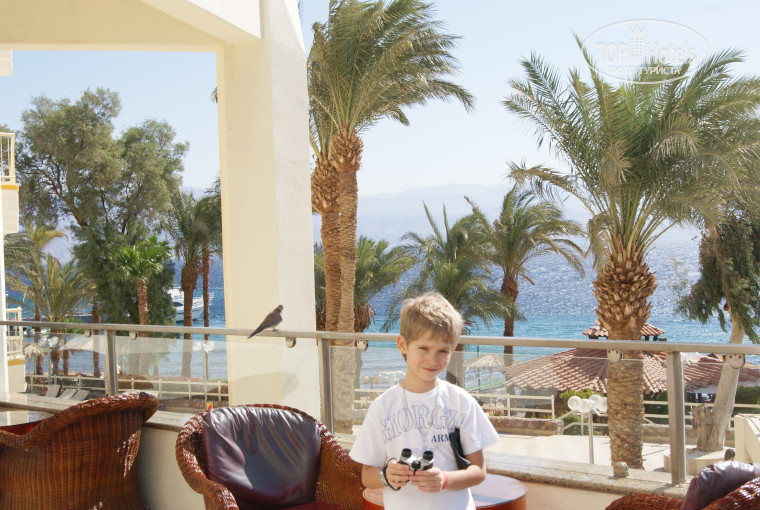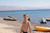 Можно отметить удачный вариант планирования отеля: буквально везде где вы находитесь, вы видите море. (все кафе, ресторанчики...) Поэтому довольно приятно завтракать каждое утро под лучами солнышка и шум морского прибоя. Кстати, море здесь довольно спокойное, все-таки Эйлатский залив Красного моря, кораллы довольно красивые на стыке двух отелей (здесь их всего два, дальше Израиль). Мы плавали на катамаране и кайяке вроде бы рядом с берегом, а коралловые рифы сразу становятся понятными. Довольно красиво. А у берега - мелкая галька, спокойный вход, не резкая глубина, для детей раздолье. Рядом детская площадка, здесь же в 11 утра занятия йогой, которые собирают довольно много поклонников, затем аквааэробика в боссейне с морской волной. Позднее, помимо прочего, танец живота и уроки арабского для всех желающих. Вечером для детей мини-диско...