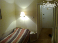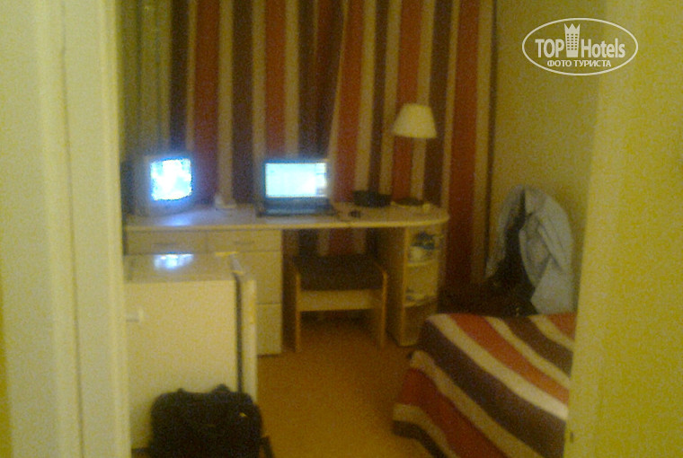 Номер 3 шага в ширину (может у меня шаги длинные?) и целых 6 шагов в длину. В нем есть платяной шкаф (в прихожей), маленький холодильник (прям посередине комнаты) письменный стол, на нем – маленький телевизор (12 каналов), односпальная кровать, стул и табуретка. На стене – зеркало во всю стену.