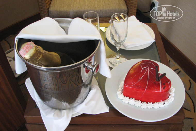 Так как мы молодожены, то нам в номер принесли торт и шампанское и ещё дали один бесплатный ужин в ресторане на выбор.
